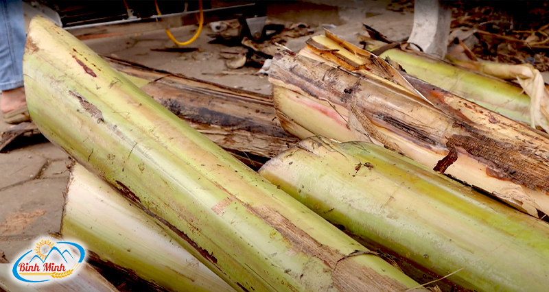Bà con chỉ cần đặt thân cây chuối lên, con lăn sẽ hỗ trợ đẩy nguyên liệu vào buồng băm nhẹ nhàng, không tốn sức