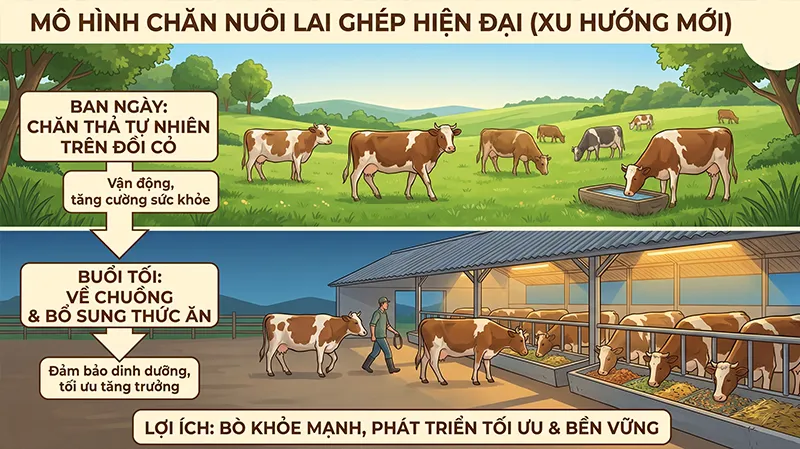 Theo các chuyên gia, xu hướng hiện nay là mô hình kết hợp bán chăn thả. Ban ngày cho bò vận động ở bãi gần nhà, chiều tối đưa về chuồng và bổ sung thêm thức ăn tin. Cách này giúp bò vừa khoẻ, vừa đảm bảo tốc độ tăng trưởng