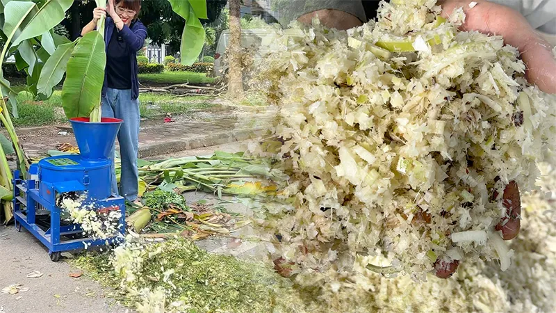 - Máy băm chuối đa năng: xử lý băm nhỏ thân cây chuối, rau cỏ thành thức ăn xanh mịn, giúp gà con dễ ăn – dễ tiêu