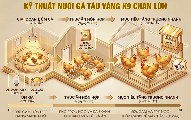 Để nuôi gà Tàu Vàng K9 ( chân lùn) nhanh lớn và đảm bảo chất lượng thịt săn chắc, bà con cần áp dụng quy trình kỹ thuật nghiêm ngặt từ khâu chọn giống, chế độ dinh dưỡng đến quản lý sức khoẻ