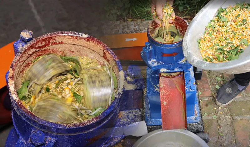 Phối trộn ngô hạt, bột ngô và rau xanh ép thành viên để gà làm quen với thức ăn thô, giúp bộ máy tiêu hoá phát triển