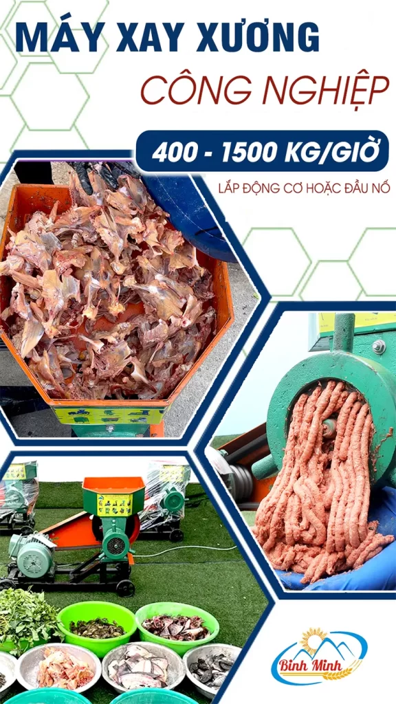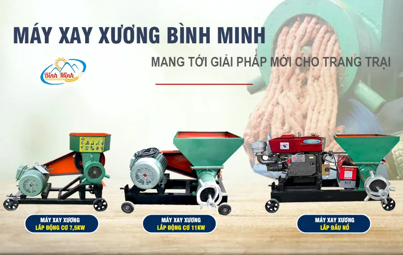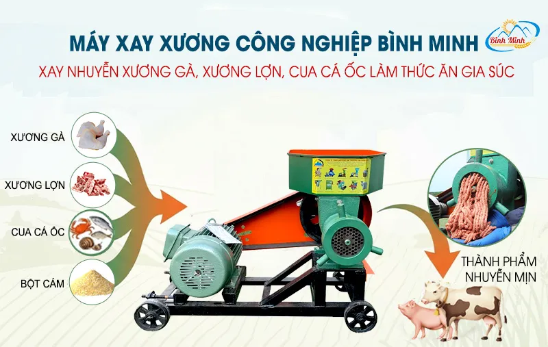 Máy xay xương Bình Minh, hiện có 3 phiên bản linh hoạt cho bà con chạy máy dù ở vùng đồng bằng, các xưởng sản xuất hay trung du miền núi cũng có thể sử dụng;