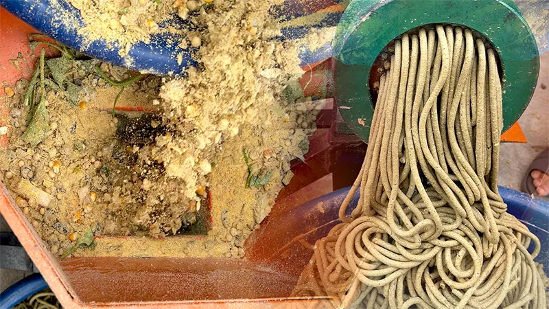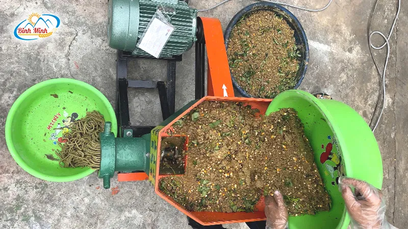 - Đùn hỗn hợp bột cám tạo thành thức ăn dạng viên dài