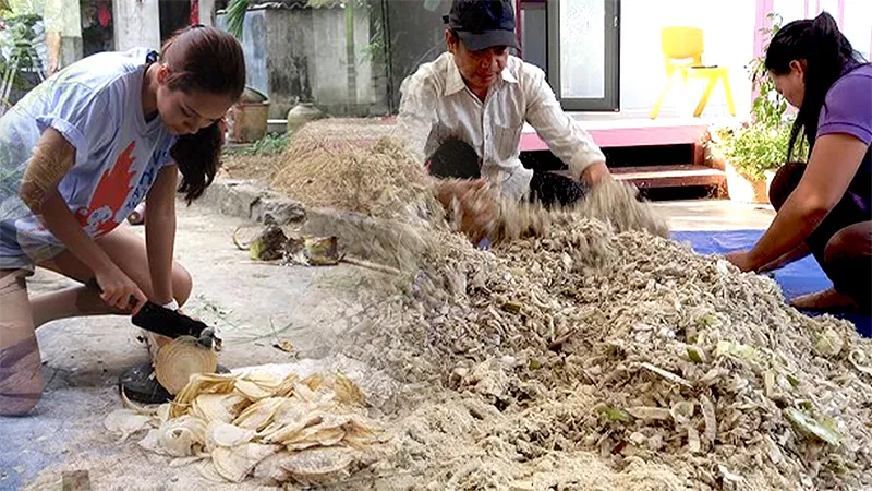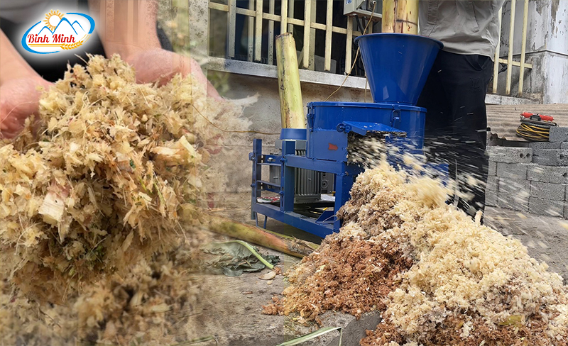 Cách làm này tốn nhiều sức mà cá chỉ ăn phần non, loại bỏ phần già, bà con nên sử dụng máy băm chuối chuyên dụng để băm – thái nhỏ thân cây chuối cho thành phẩm ra đều mà năng suất cao