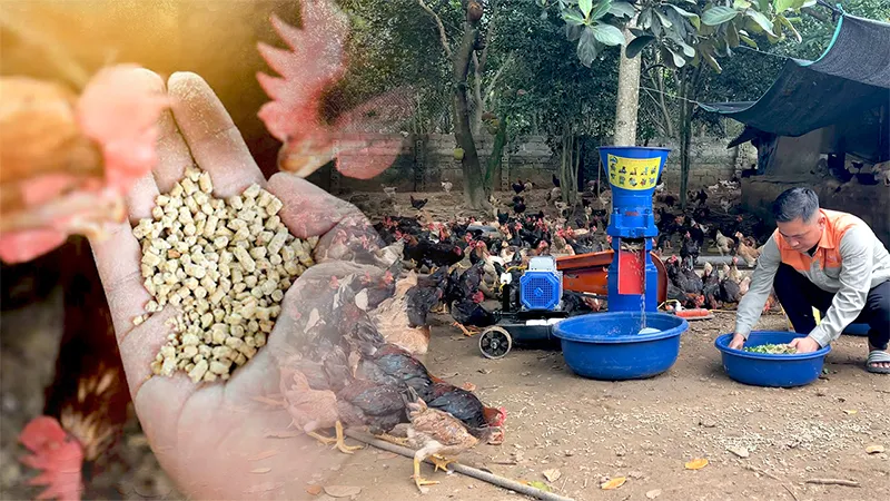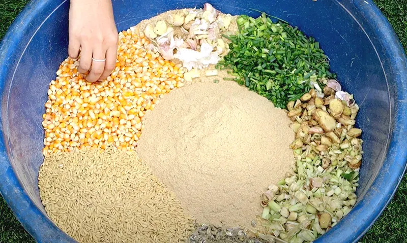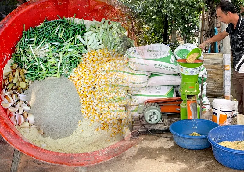 - Tự chủ nguồn cám chất lượng: sử dụng máy nghiền xay ngô, thóc thành bột cám. Sau đó, dùng máy ép cám viên để phối trộn bột cám và rau xanh