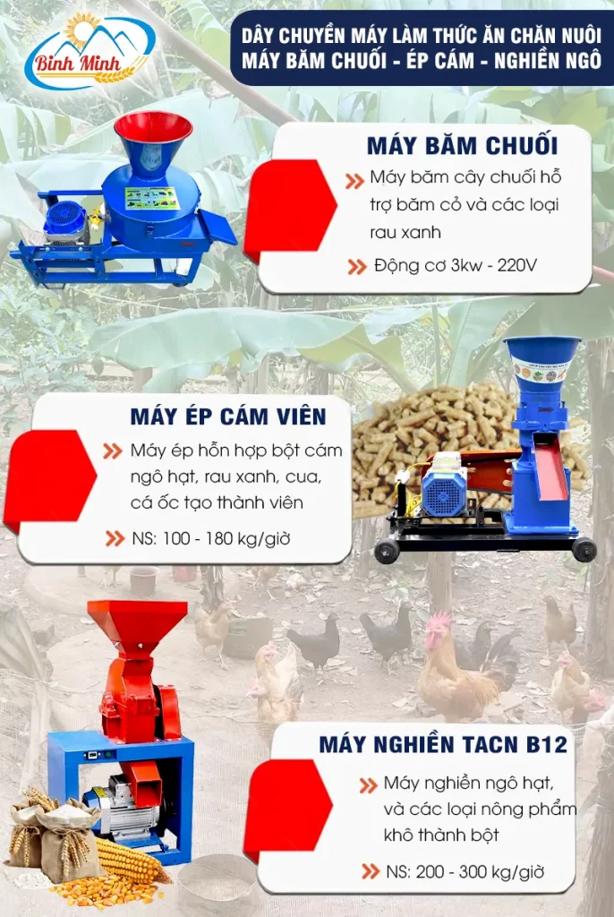Bà con có thể tham khảo các dòng máy nông nghiệp hỗ trợ chăn nuôi của Bình Minh – đơn vị chuyên sản xuất các dòng máy băm chuối, máy ép cám viên, máy nghiền ngô.. giup tối ưu hoá quy trình chăn nuôi