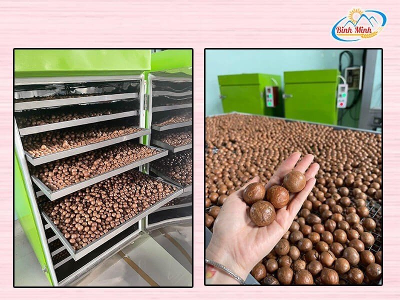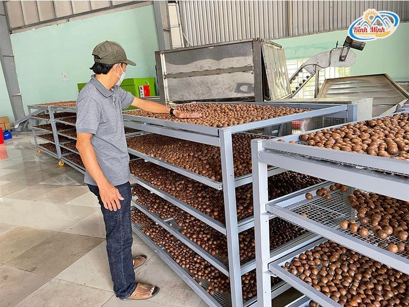 Tiếp theo, chuyển sang công đoạn sấy khô hạt macca. Thời gian sấy khô từ 10-15 tiếng. Độ ẩm  của hạt đạt mức từ 10-13% để giúp hạt macca được bảo quản được lâu hơn.