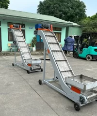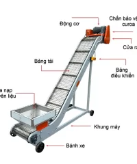 Trên bề mặt băng tải kết hợp với các thanh ngang tạo thành các khoang chứa nhất định, giúp nguyên liệu không rơi ra ngoài