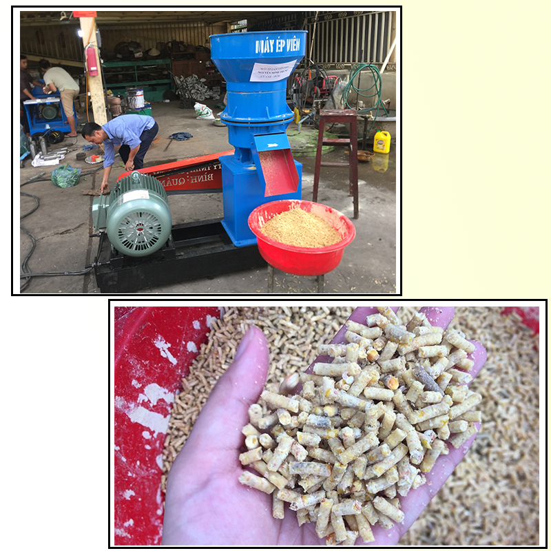 - Có thể Nghiền – Trộn – Ép được các nguyên liệu thô như ngô hạt, lúa, bột cám, cua, cá, ốc, rau bèo,… thành cám viên giúp bà con tận dụng được những nguyên liệu sẵn có giúp tiết kiệm chi phí chăn nuôi