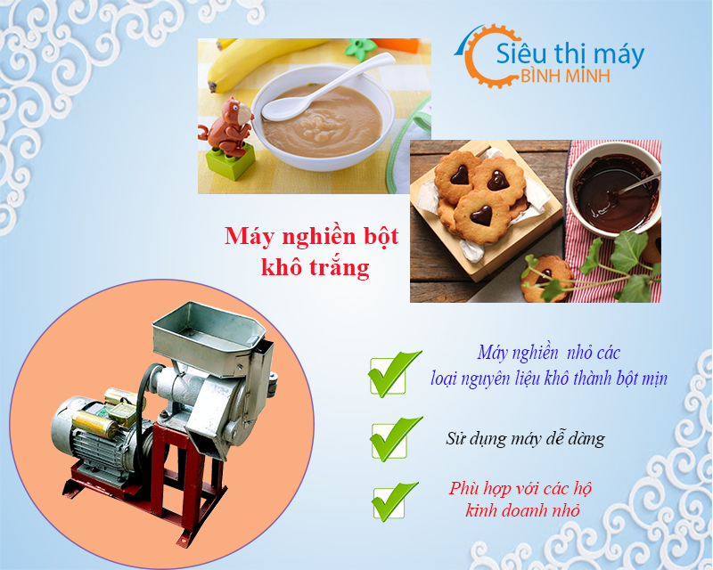 Ngày nay, nhu cầu chế biến thực phẩm cho trẻ em luôn được các bà mẹ bỉm sữa hay các cơ sở kinh doanh nhỏ quan tâm. Hiểu được nhu cầu đó, Công Ty Bình Minh đã sản xuất và nghiên cứu dòng máy nghiền bột khô trắng phục vụ cho nhu cầu đó.