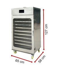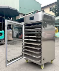 Bên trong khoang gồm 10 tầng khay sấy dạng lưới được là bằng inox cao cấp an toàn vệ sinh thực phẩm, với năng suất mỗi mẻ khoảng 30-50kg ( tuỳ nguyên liệu)