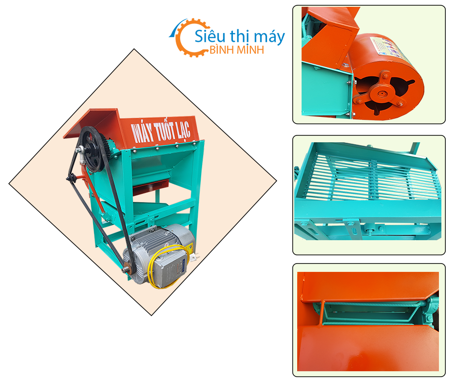 Với hệ thống máy tuốt lạc sẽ bao gồm: hai lồng tuốt ngược chiều có nhiệm vụ quay tròn và ép chặt tạo lực tách củ lạc ra khỏi thân cây lạc một cách dễ dàng và sạch sẽ. Hệ thống sàng rung và hộp quạt gió có nhiệm vụ sàng lọc và thổi bay những bụi bẩn, lá còn lại ở củ lạc.